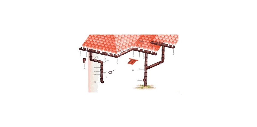 - W przypadku, gdy długość okapu mieści się w granicach 10 - 12 m, montuje się jedną rurę spustową na końcu rynny, w narożniku budynku.